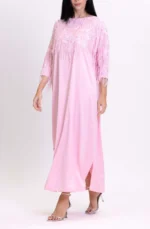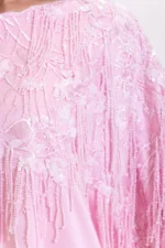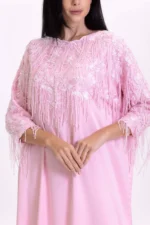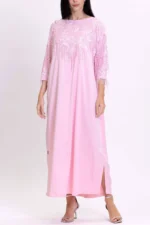 Description: This elegant pink dress, made from luxurious silk crepe, is perfect for special occasions. It features a stunning hand-embroidered design with intricate beading, adding a touch of sophistication and glamour. The flowing silhouette and full-length style make it a timeless and graceful choice for any event.