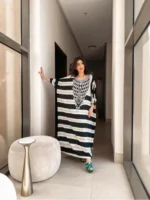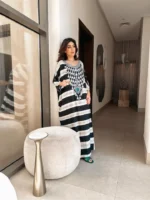 Dive into khulood arts with a classic arab design ,a blend of artistic pattern and luxurious comfort .Crafted from smooth crepe with delicate and light sensation, It features elegant dolman sleeves with a touch of crystals surrounding the neck.