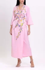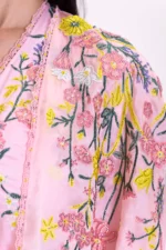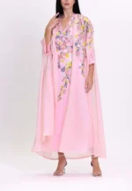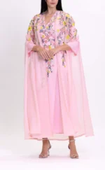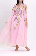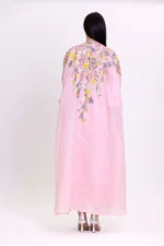Description: This elegant and stylish two-piece dress features a stunning overlapped design on the inner layer, beautifully embroidered with delicate floral patterns. The top part is a luxurious organza cape, also adorned with floral embroidery over the shoulders, adding an extra touch of sophistication. Perfect for special occasions, this ensemble combines intricate detailing and refined elegance seamlessly.