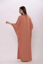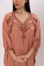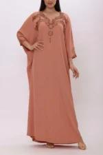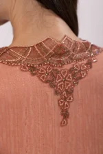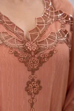 Description :This loose-fitting dress is crafted from luxurious silk Jacquard fabric, featuring a warm, earthy tone. The intricate lace detailing, adorned with sparkling crystals, enhances the neckline, sleeves, and front, adding a touch of elegance. Perfect for any special occasion, this dress seamlessly combines comfort and sophisticated style.