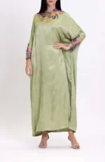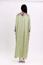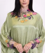 This loose silk Jacquard dress features a high neck and sleeves adorned with colorful floral embroidery and crystals. The vibrant details add elegance and sophistication, making it perfect for special occasions.